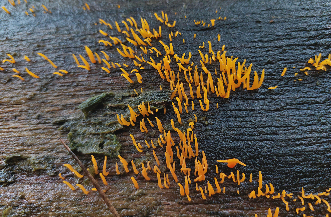 Een achtergebleven stuk van een afgezaagde dennenstam is bijna in z'n geheel begroeit door de Citroenstrookzwam.