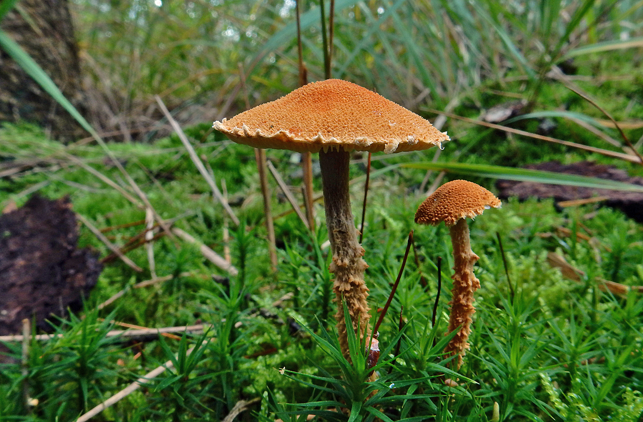 De dop heeft meestal een diameter tussen 2 en 5 cm, convex tot klokvormig en later plat met een lichte indrukking rond een lage umbo (centrale naaf). Het is droog en poederachtig, vaak met een ruige of omzoomde marge (appendiculate), en is saffraan-geel of oranje-oker. De stengel is cilindrisch en heeft een schilferige korrelige schede onder een vluchtige, poederachtige ring. De kieuwen zijn aanvankelijk wit en worden later romig. Ze zijn verbonden (nauw verbonden met de stengel) en aanvankelijk behoorlijk druk. De sporenafdruk is wit. Het vlees is dun en geelachtig, met een onaangename beschimmelde geur.