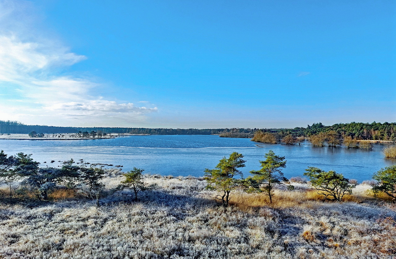 Vanmorgen zag het weer wit van de Rijp Alles wat niet beschutwas, en waar vocht op zat was door de nachtvorst wit geworden. Mooi voor de foto natuurlijk. Op mijn dagelijkse fietstocht door Landgoed de Utrecht zag ik de kans schoon om de Flaestoren te beklimmen en enkele foto's te nemen van het uitzicht over het water van de Flaes en de heide bij het Goor.